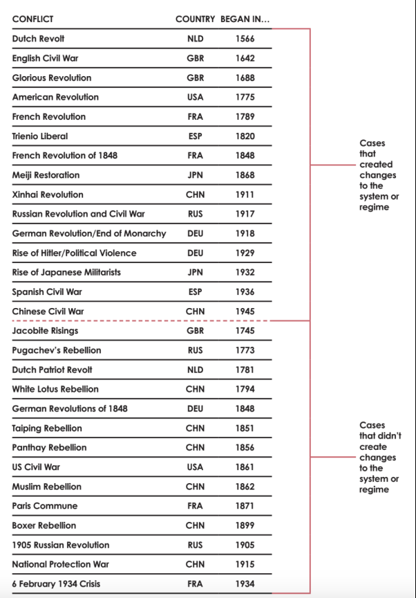 Míg az előző részben a rendben lezajlott erőszakmentes forradalmakat vizsgáltuk, ebben a részben a polgárháborúk és a szinte mindig erőszakos forradalmak jelzőit és mintázatait vizsgáljuk meg, amelyek megdöntötték a régi rendet, és egy újjal helyettesítették azt. Bár számtalan példa van, amelyeket megvizsgálhattam volna, hogy megértsem, hogyan működnek, én a 29 legjelentősebbnek vélt esetet választottam ki, amelyeket a következő táblázat mutat be. Ezt a csoportot két csoportra osztottam: azokra, amelyek nagy változásokat hoztak a rendszerben/rezsimben, és azokra, amelyek nem. Például az amerikai polgárháború egy igazán véres polgárháború volt, amely nem tudta megdönteni a rendszert/rendet, így a táblázat alján, a második csoportban található, míg azok, amelyek megdöntötték a rendszert/rendet, a tetején találhatók.