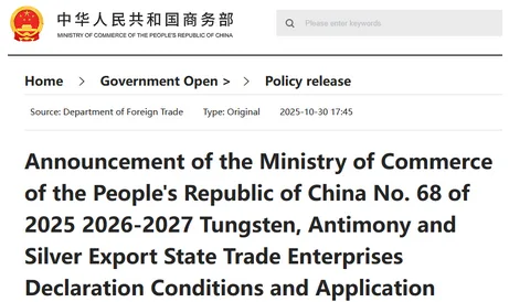 A Kínai Népköztársaság Kereskedelmi Minisztériuma (MOFCOM) ugyanis nemrég kiadta a 2025-68. számú bejelentést, amely szigorú feltételeket szab három kritikus fontosságú fém – a volfrám, az antimon és az ezüst – exportjára a 2026–2027-es időszakra.